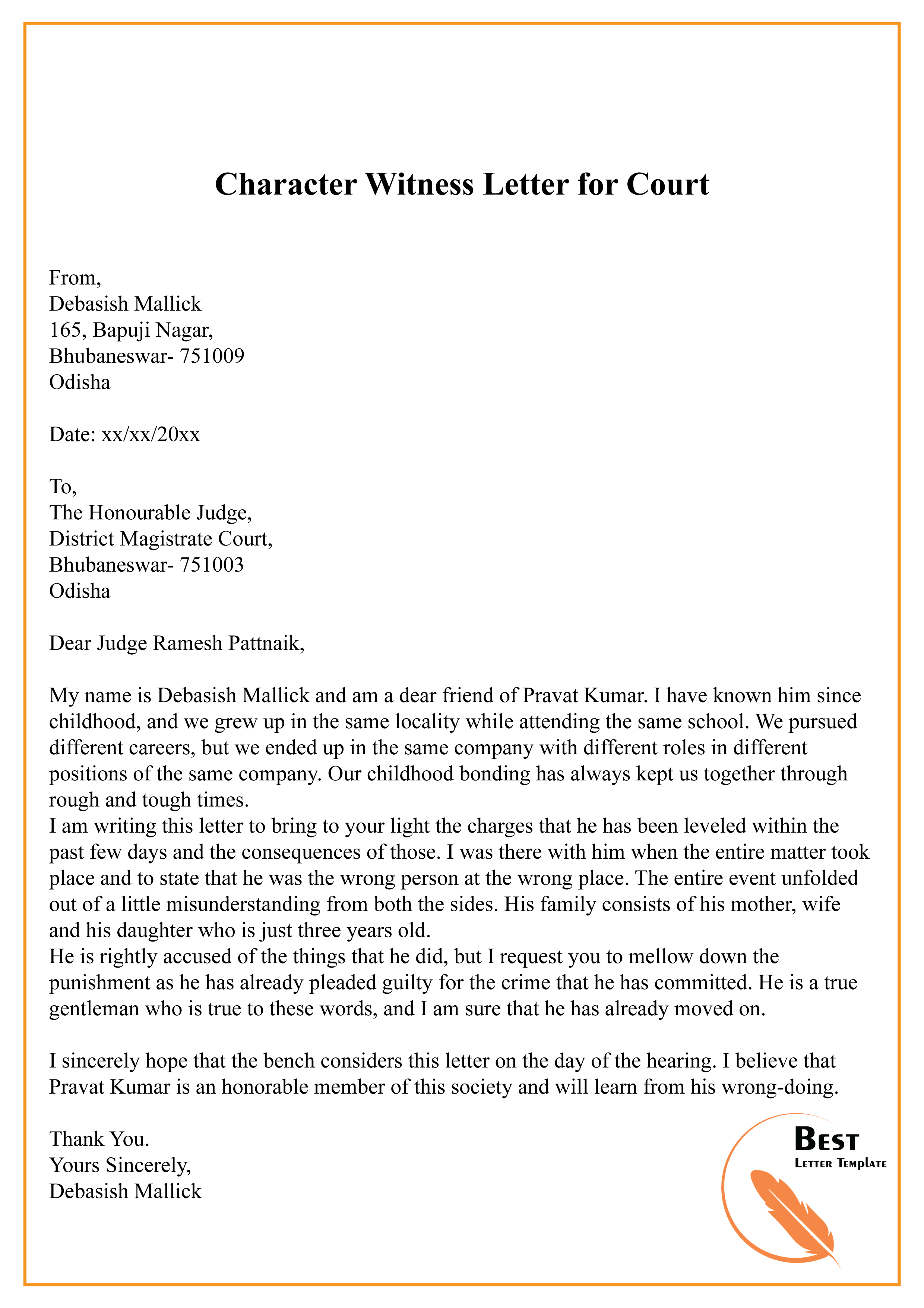 Character Witness Letter Template
